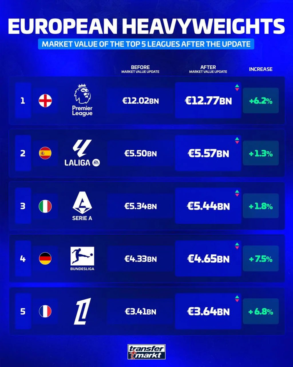 10月20日讯 德国转会市场近期更新了五大联赛球员的身价,并将各大联赛按照身价总和进行了排名: