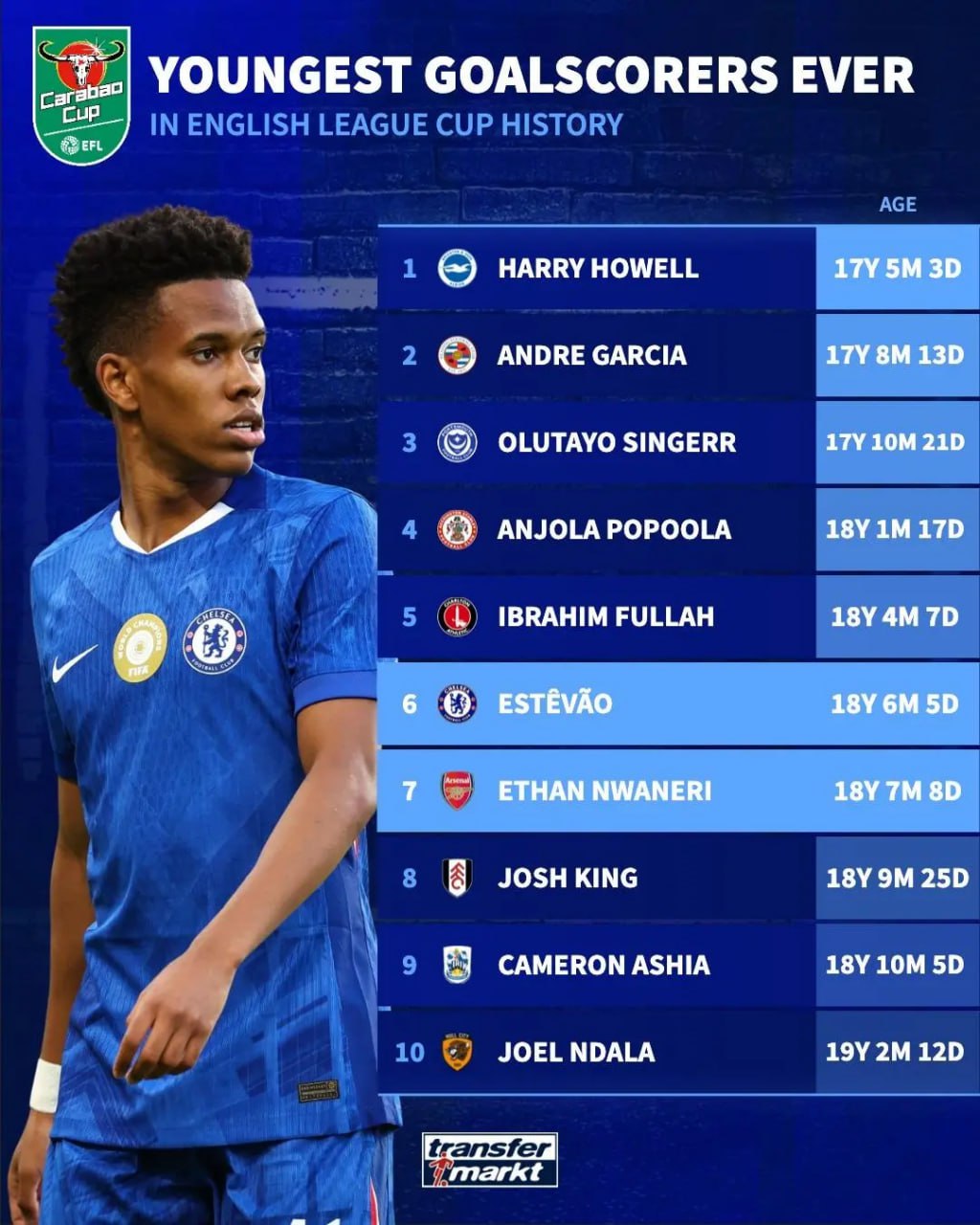 德转盘点英格兰联赛杯历史上最年轻进球球员榜,埃斯特旺、恩瓦内里在列。