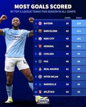 德国转会市场统计了五大联赛球队本赛季各赛事的进球数量,并列出榜单,拜仁128球居首,巴萨111球次席。