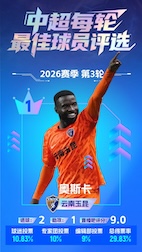 2026中超第3轮最佳球员评选结果出炉,最终云南玉昆外援奥斯卡以29.83%的总得票率当选。