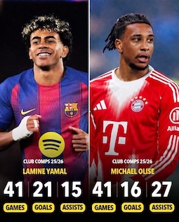 外媒列出了本赛季亚马尔和奥利塞的数据,并将两人称为当今足坛最出色的右边锋。